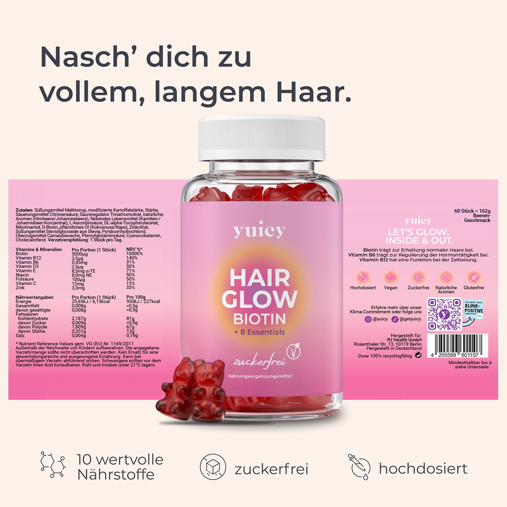 - Hair Glow Gummies (zuckerfrei) = Fördern ein gesundes Haarwachstum