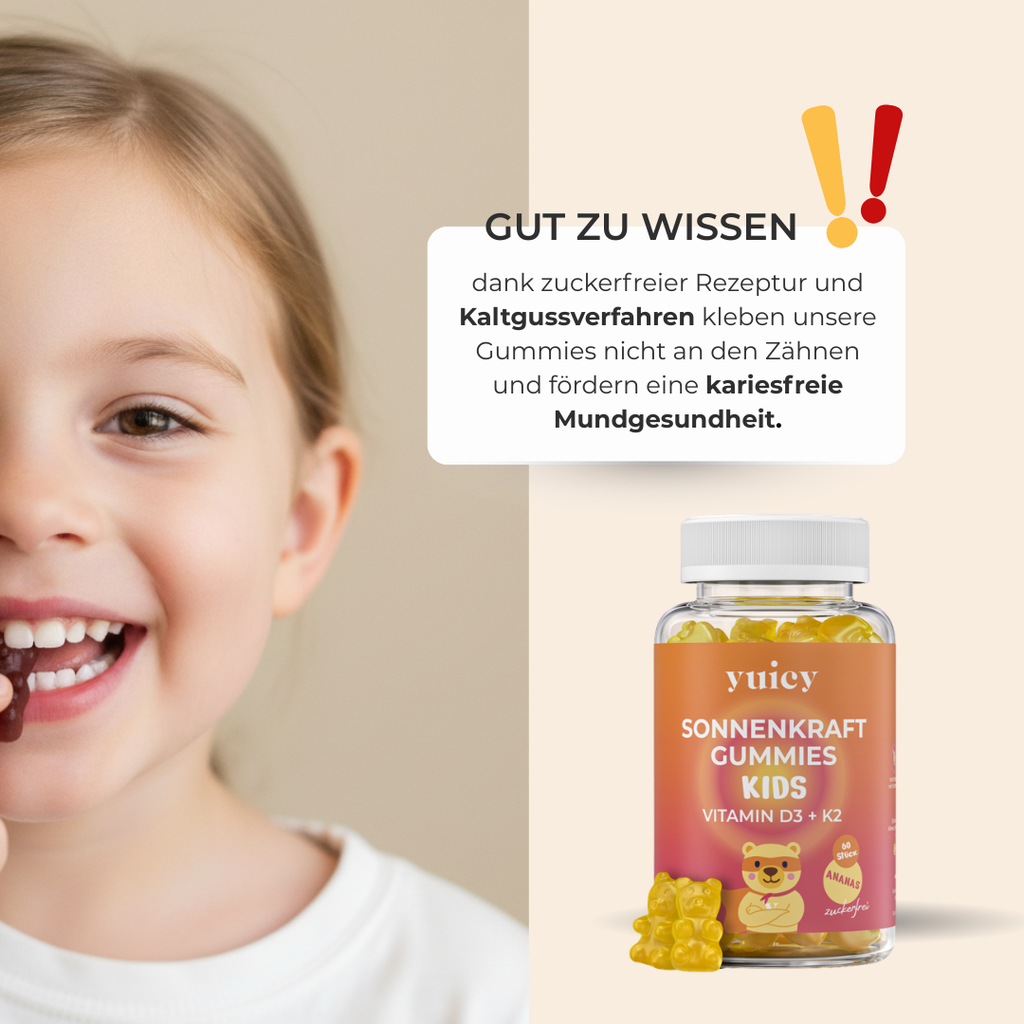 Hey, suchst du nach einer leckeren Möglichkeit, deine Kinder mit den wichtigen Vitaminen für Immunsystem und Knochenwachstum zu versorgen? Dann sind unsere yuicy® Kids Immun Sonnenkraft Gummies die perfekte Lösung für dich und deine Kleinen! 🌟 Diese Vitamin-Gummibärchen sind nicht nur super lecker mit ihrem natürlichen Ananas-Geschmack, sondern auch gesund: Sie enthalten wertvolles Vitamin D3 + K2, die zusammen die normale Funktion des Immunsystems unterstützen und zu starken Knochen beitragen. Sie sind für Kids ab 3 Jahren geeignet und unterstütze Abwehrkräfte, Knochen & Calcium-Balance!